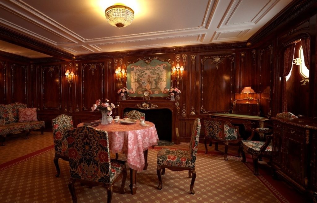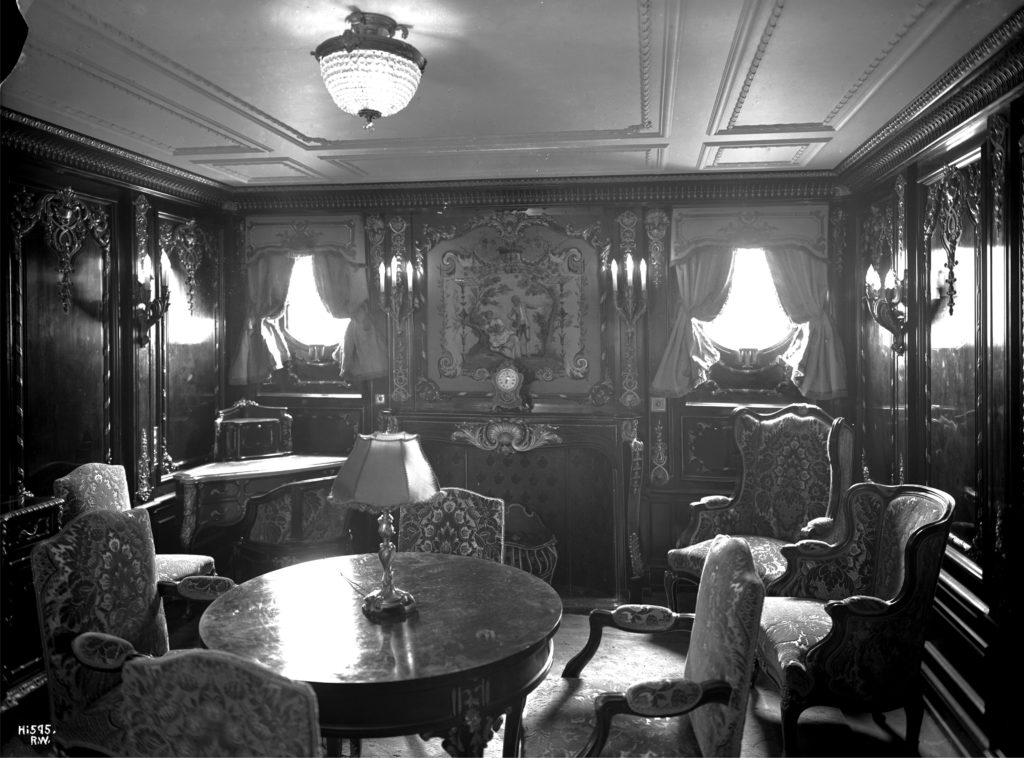Warto w tym momencie wtrącić, że na statkach klasy Olympic – czyli na Olympicu, Titanicu i Britannicu przygotowano wyjątkowy wystrój kabin pierwszej klasy. Pasażerowie podróżujący tą klasą, mogli wybrać kabinę o podwyższonym standardzie – wnętrzu przygotowanym w wybranym stylu historycznym. Stylów tych było kilkanaście i były wielokrotnie powtarzane na każdym ze statków. Natomiast, był jeden styl, niepowtarzalny, w którym wykonano tylko jedną kabinę i to był właśnie styl Regencji. W tym jednym stylu przygotowano tzw. sitting room (salon) w jednym z czterech apartamentów milionerskich na każdym ze statków.