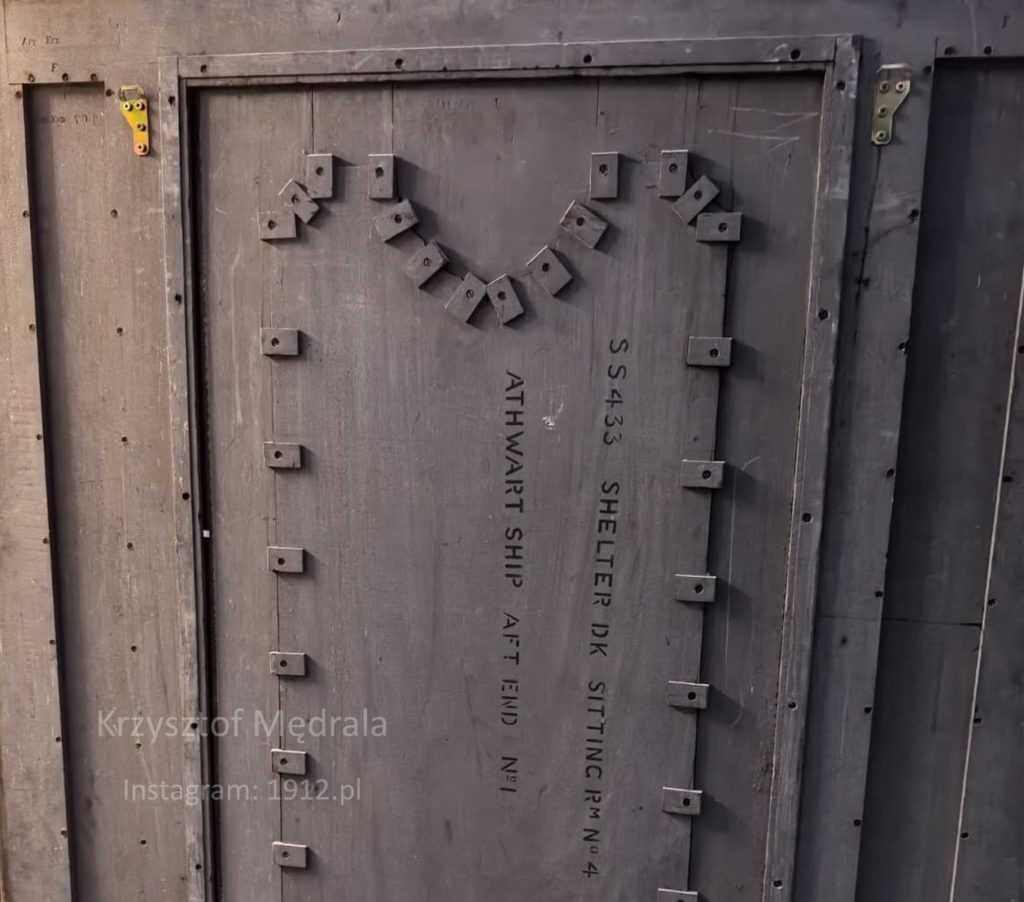Dla niektórych osób bardzo ciekawe jest to, jak dany element boazerii wygląda z tyłu. To widok, którego nie zobaczymy na żadnej wystawie, czy muzeum, zaś mówi on wiele dla osób zaznajomionych z tym, jak wykańczane były takie panele i jak były znakowane. Szara farba, widoczna na panelu z drugiej strony to farba przeciwko wilgoci, zaś liczne oznaczenia tekstowe miały być pomocne w trakcie instalowania boazerii w określonych miejscach na statku. „SS 433” to numer stoczniowy Britannica, a pokład C oznaczony jest słowami „Shelter Dk”.